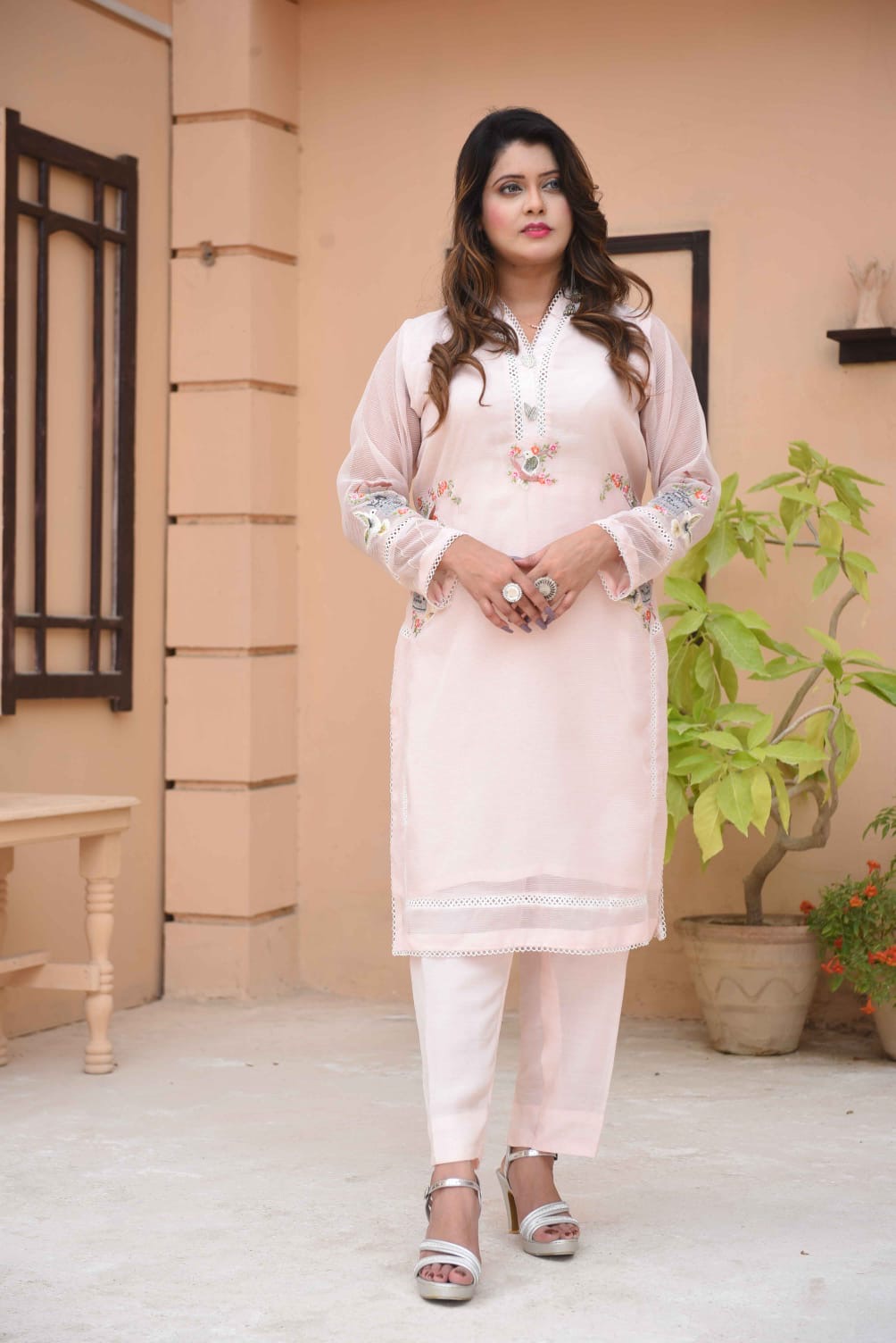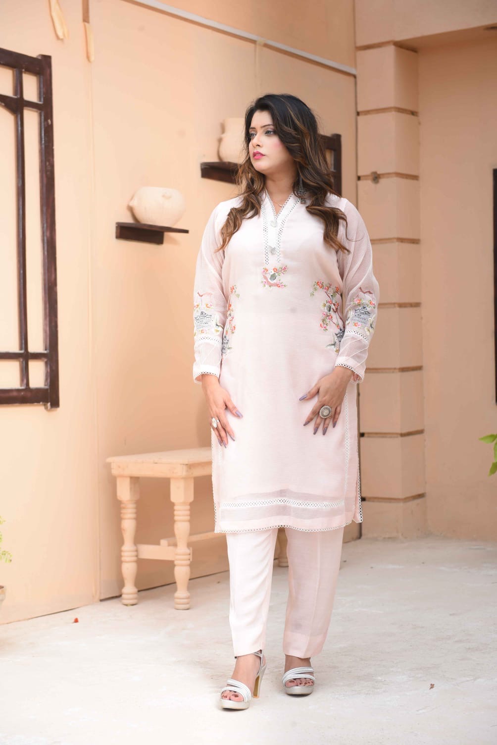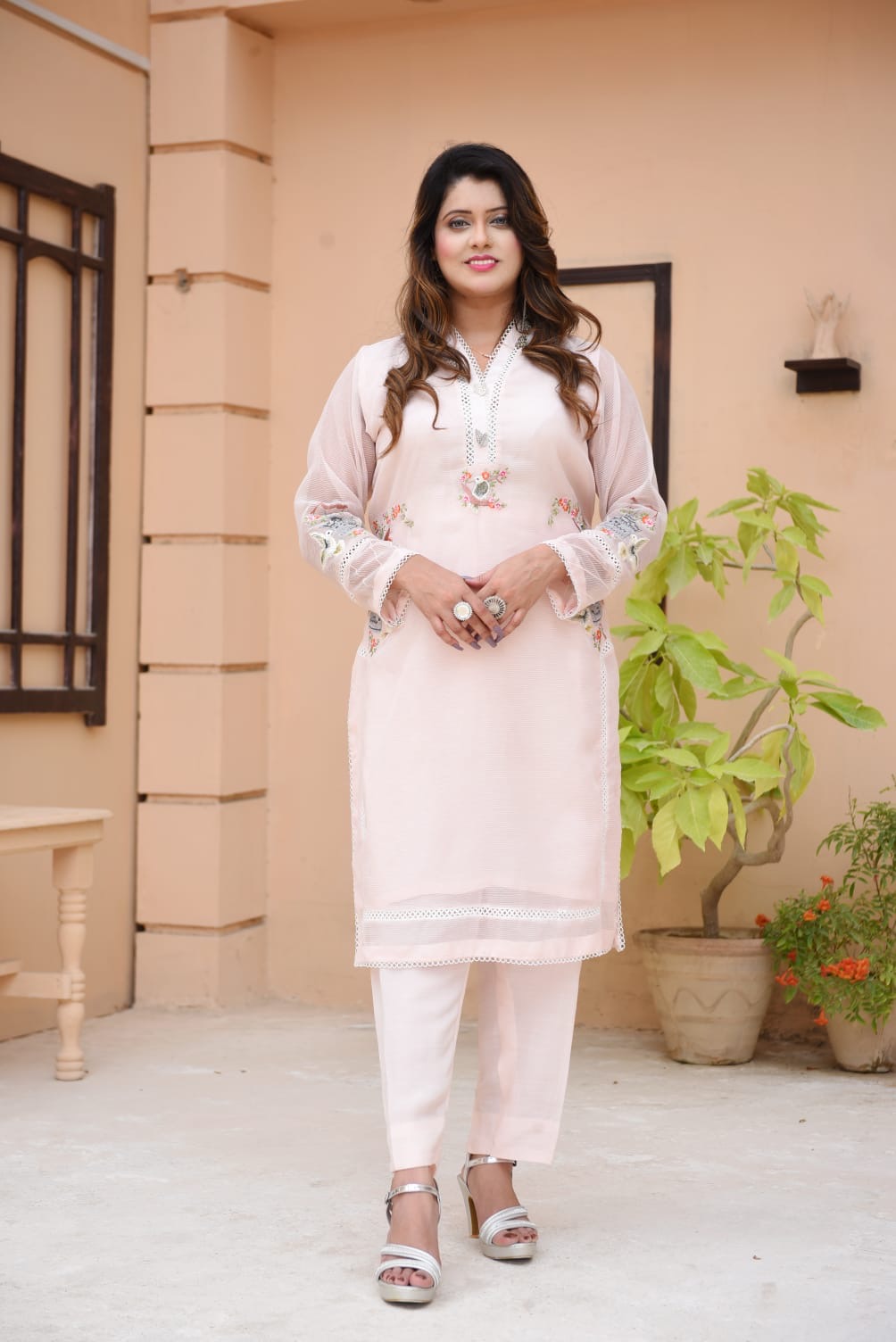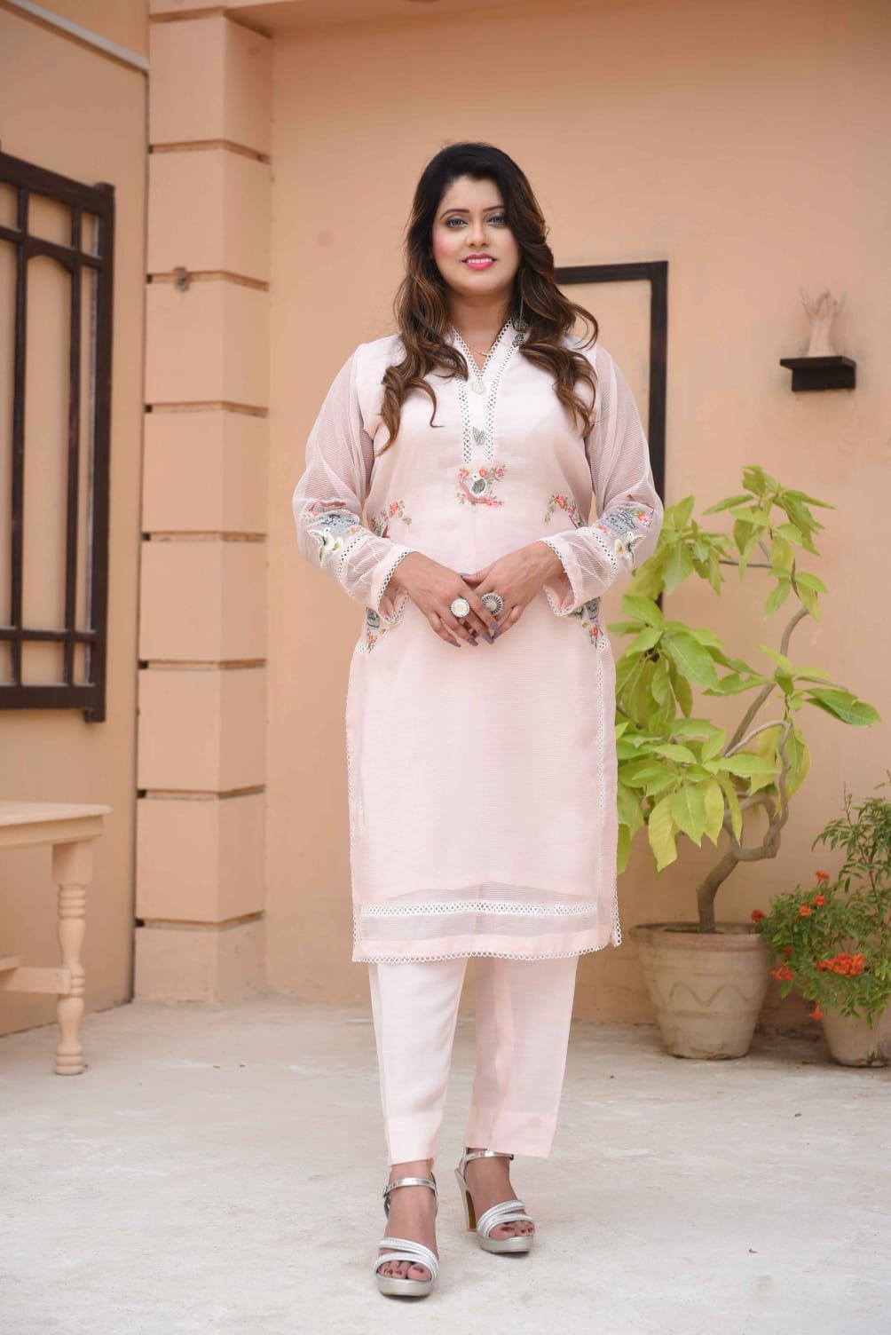 Step into effortless grace with this soft, powder-pink ensemble. Designed for the woman who appreciates subtle luxury, this outfit balances the airy lightness of organza with the grounded comfort of premium silk. It’s a timeless choice for festive brunches, evening soirées, or intimate gatherings.