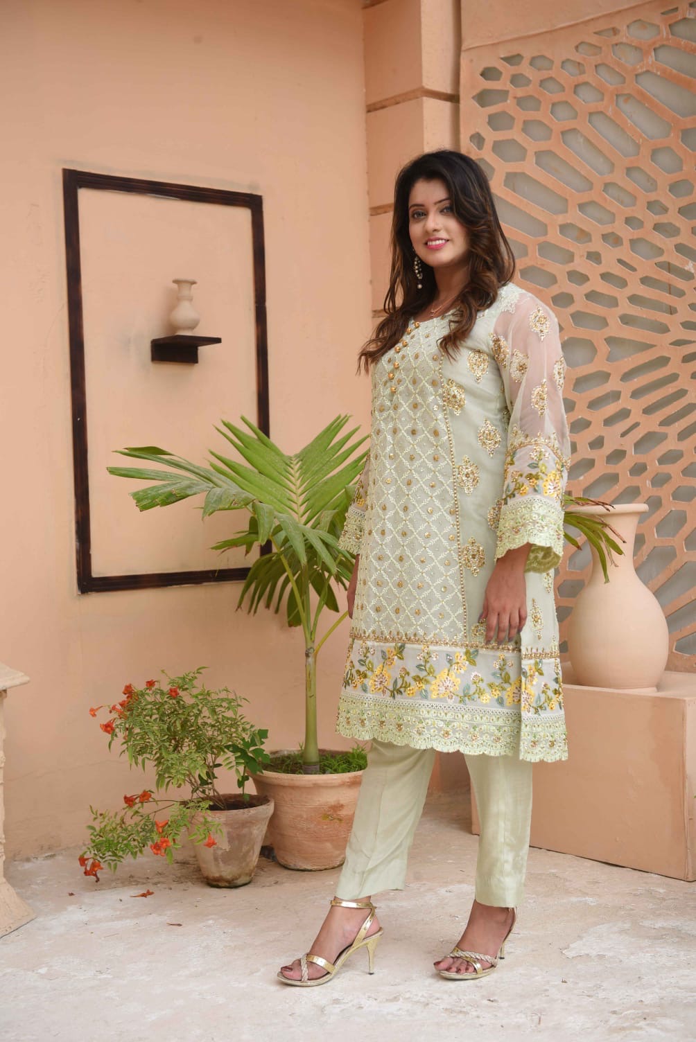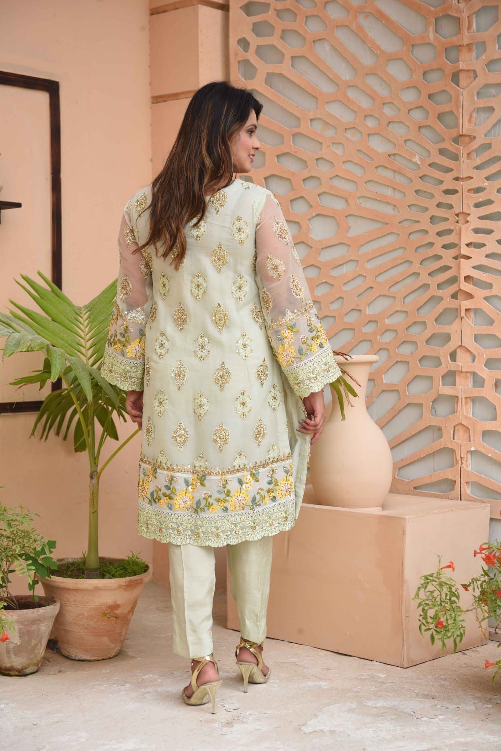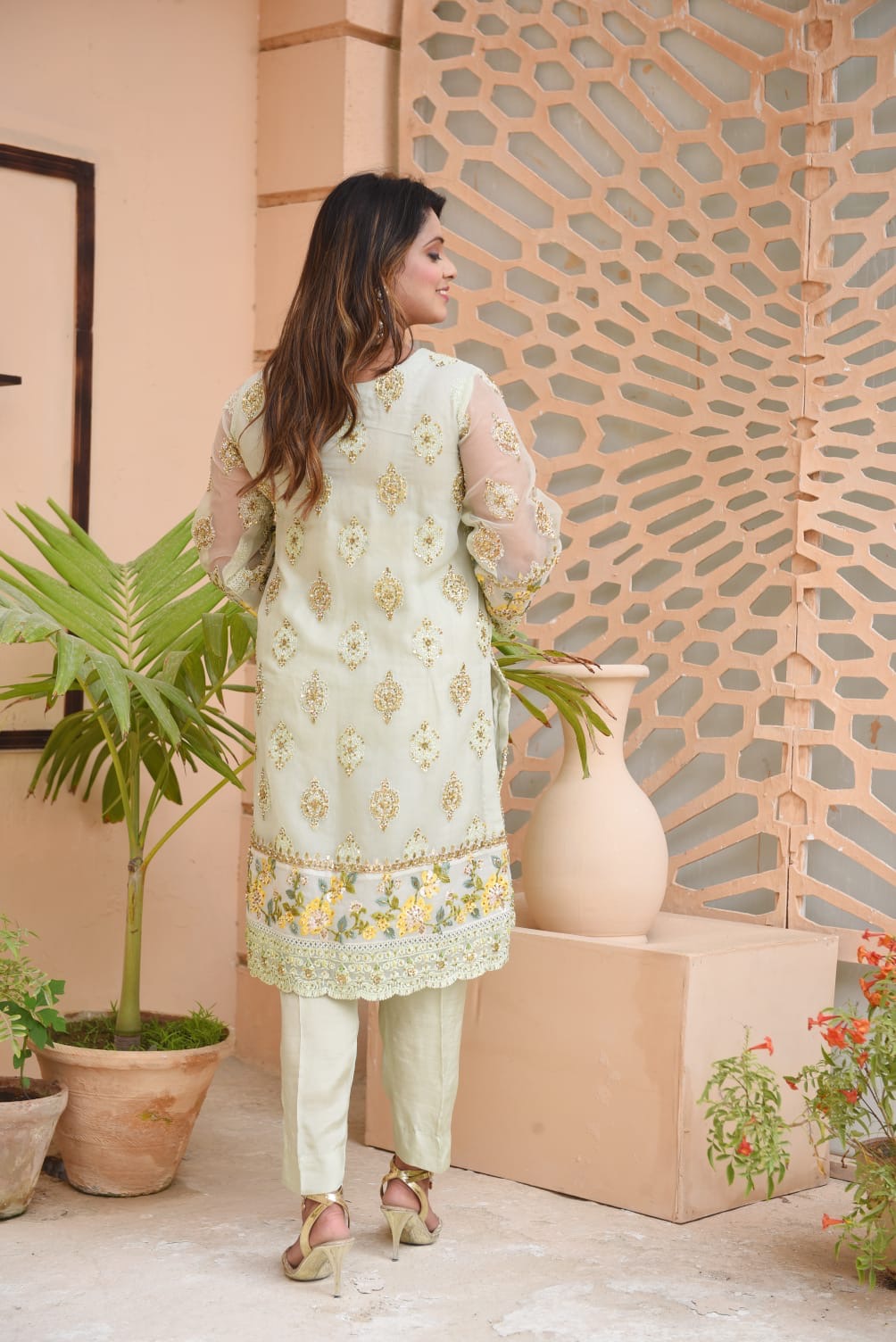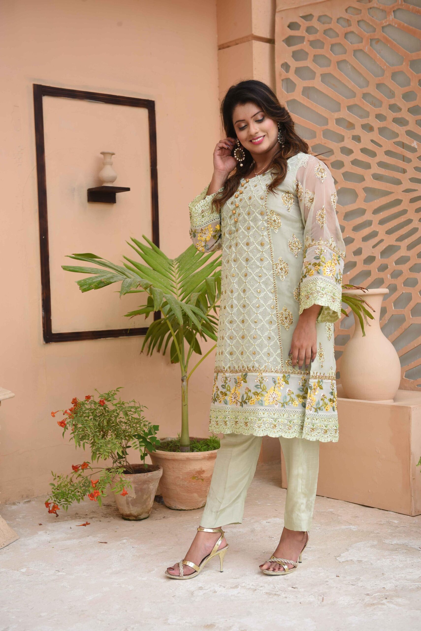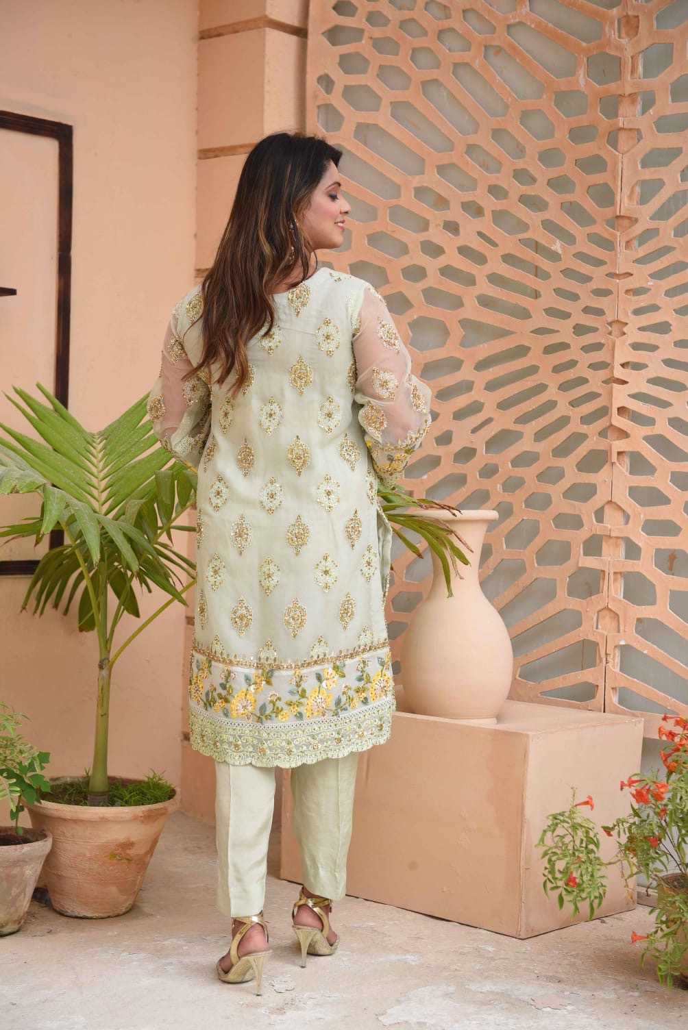• The Trousers & Inner: For ultimate comfort and a polished silhouette, the outfit includes an inner lining of cotton silk and matching apple green raw silk trousers. The trousers feature a clean, straight cut that balances the detailed texture of the organza shirt.
