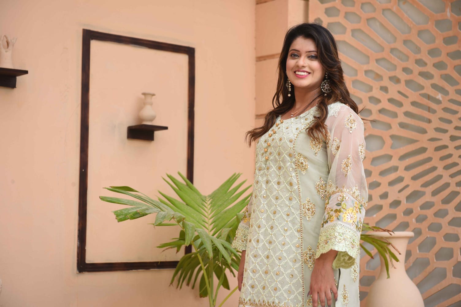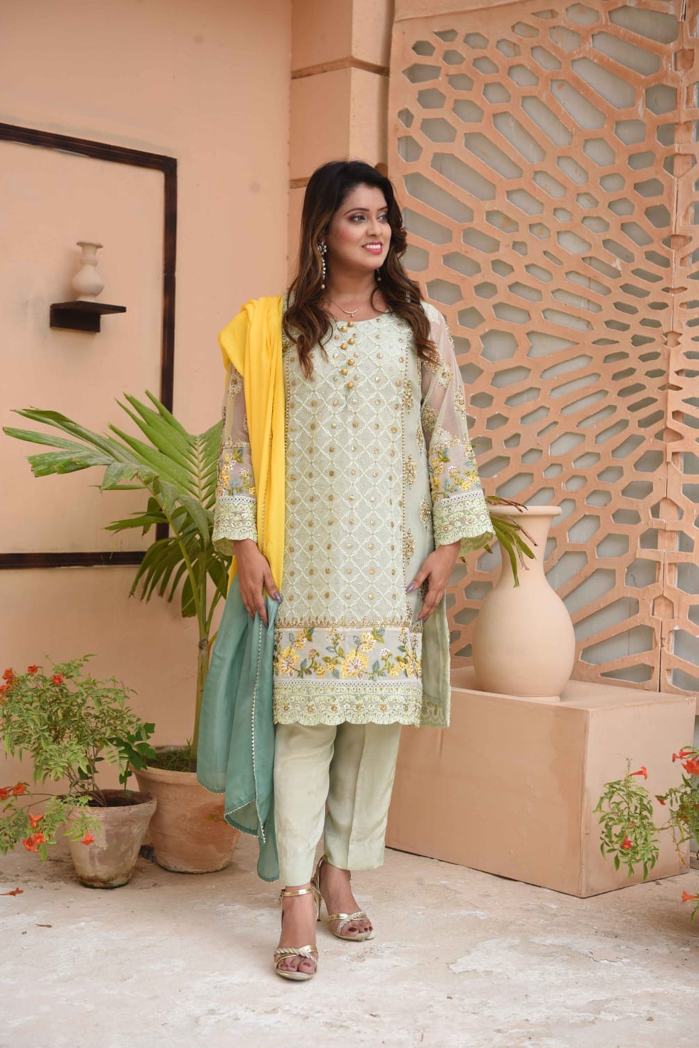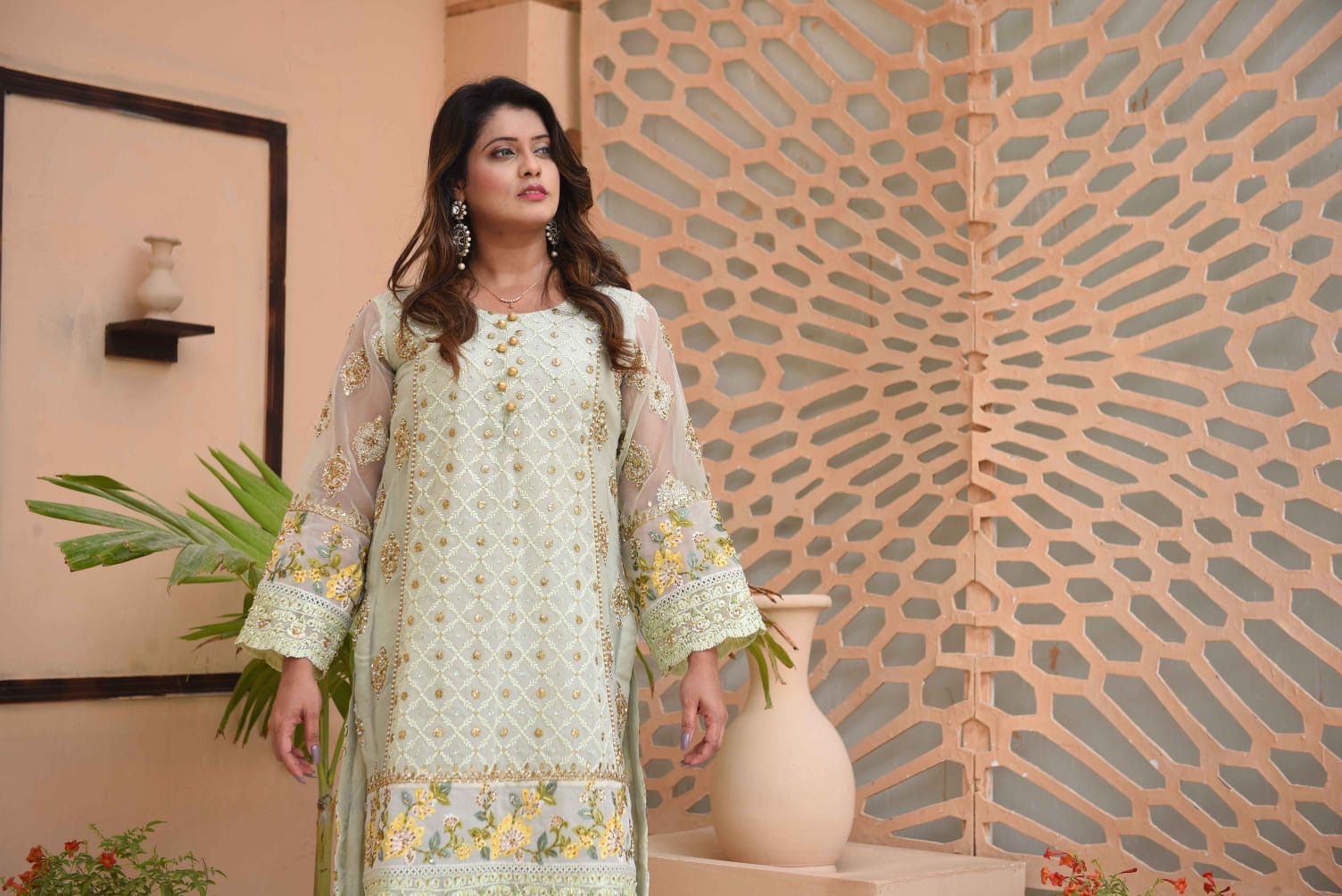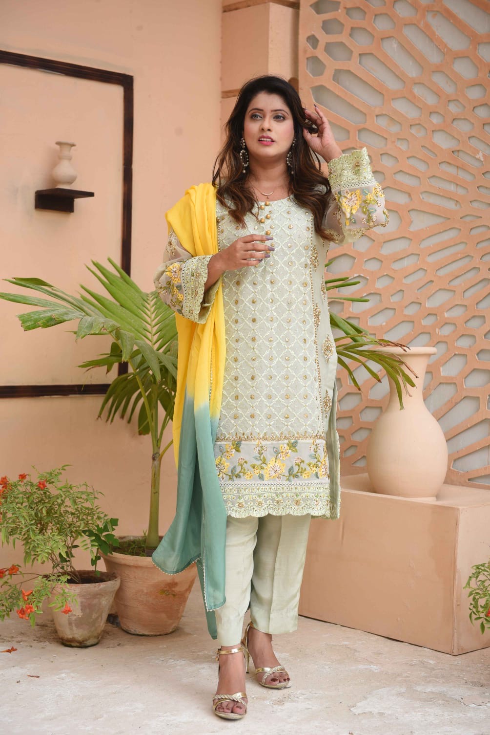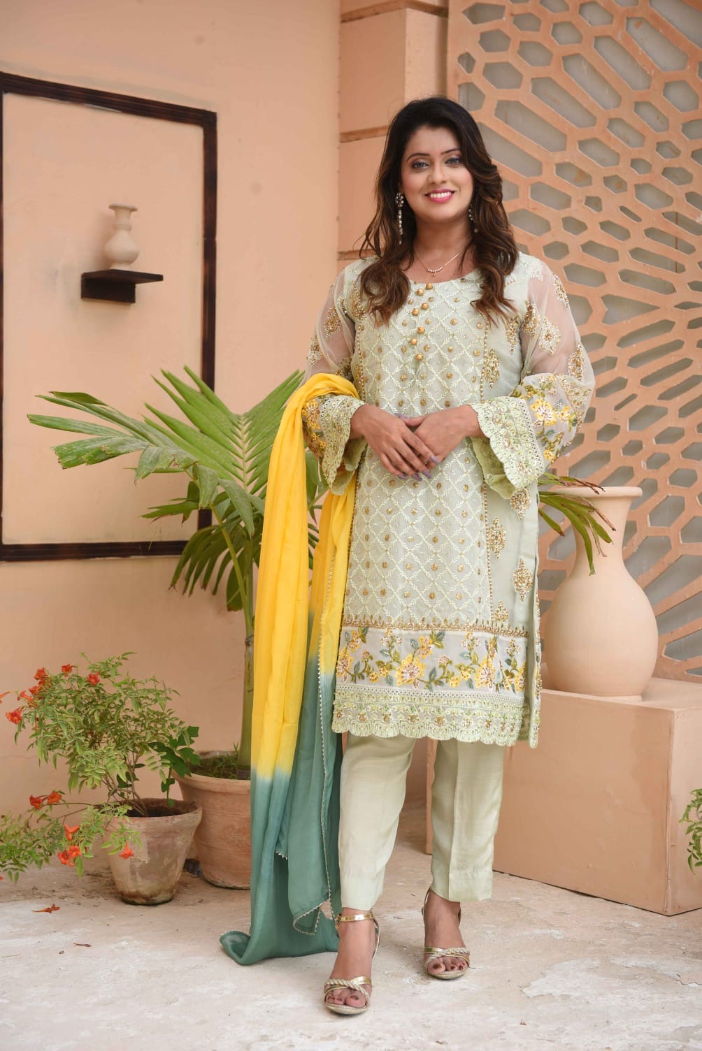 • The Trousers & Inner: For ultimate comfort and a polished silhouette, the outfit includes an inner lining of cotton silk and matching apple green raw silk trousers. The trousers feature a clean, straight cut that balances the detailed texture of the organza shirt.