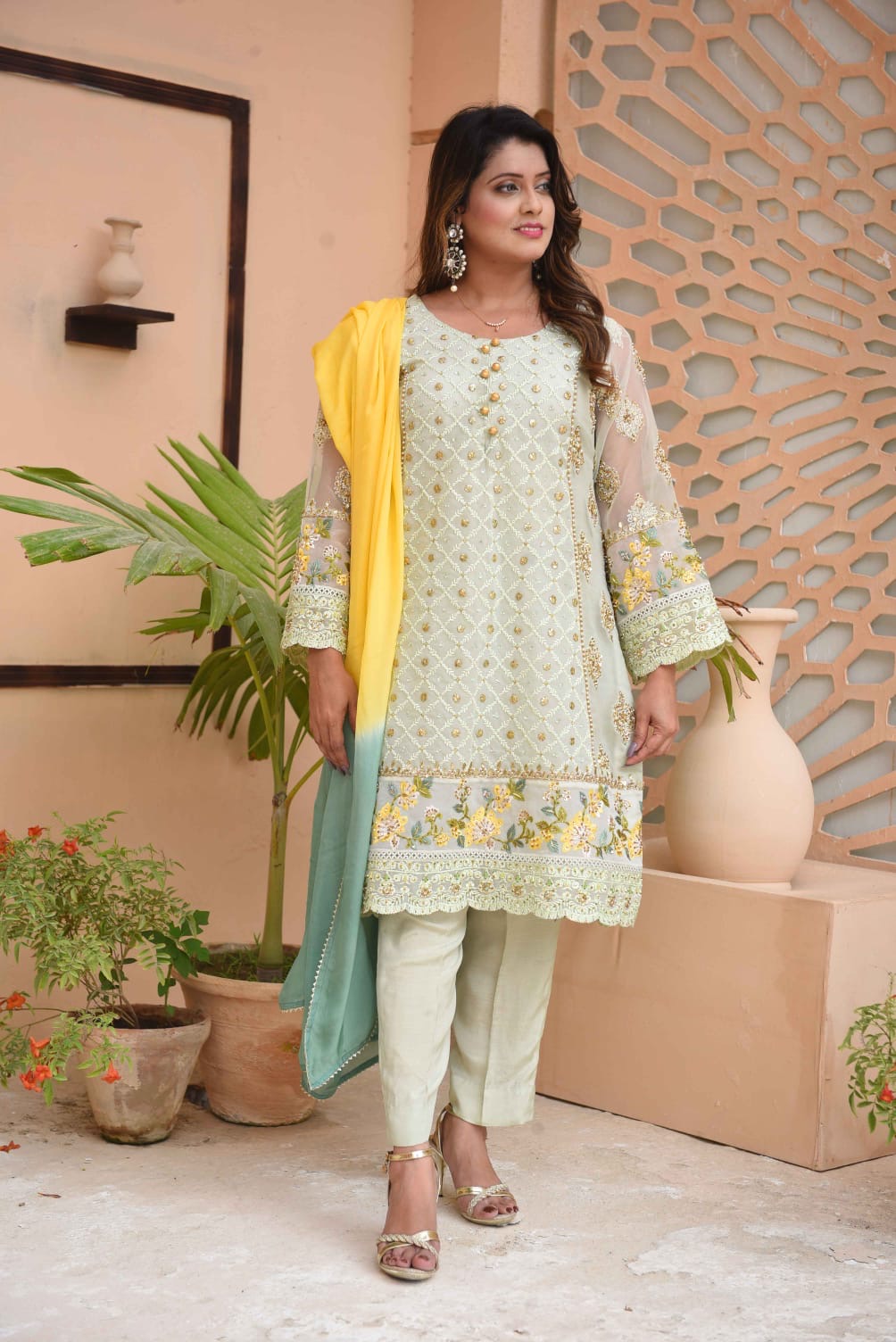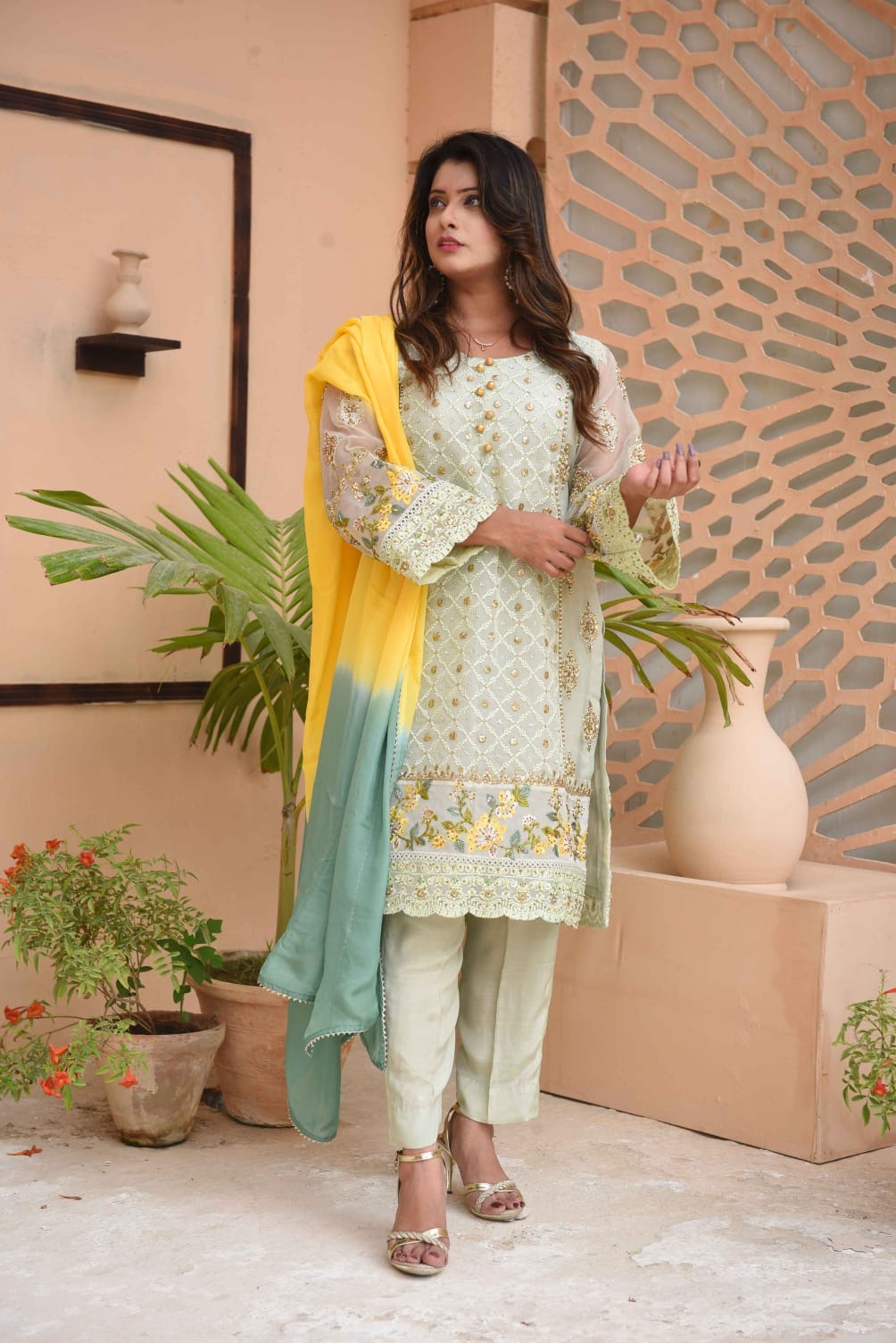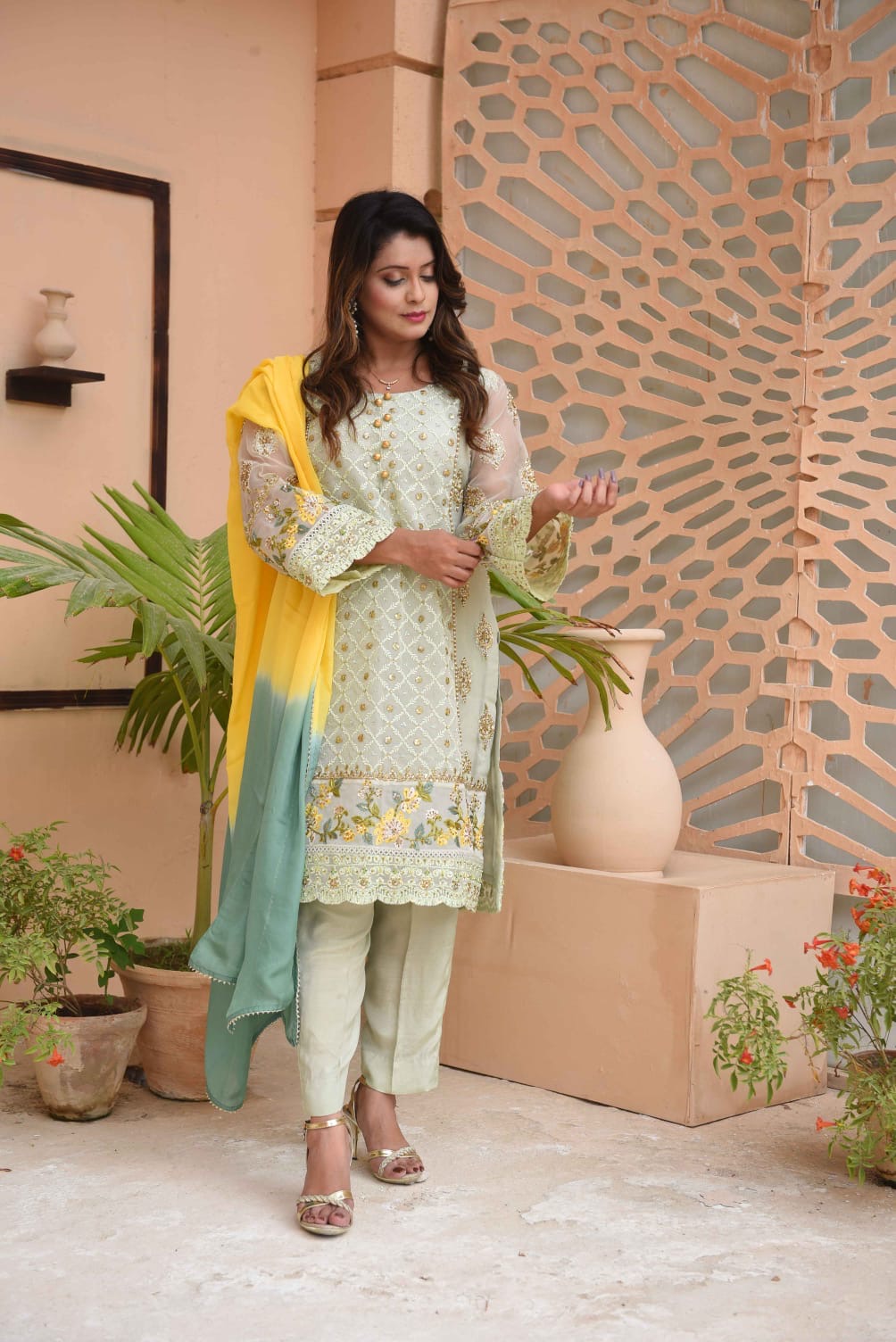 • The Dupatta: The standout feature is the two-tone silk dupatta. It transitions seamlessly from a sunny, vibrant yellow to a deep teal-green, creating a striking visual contrast against the soft pastel of the shirt. It is framed with fine lace, enhancing its graceful drape.