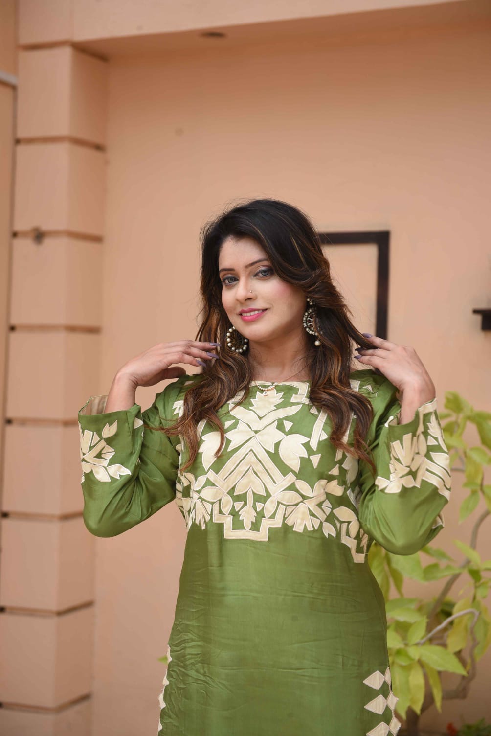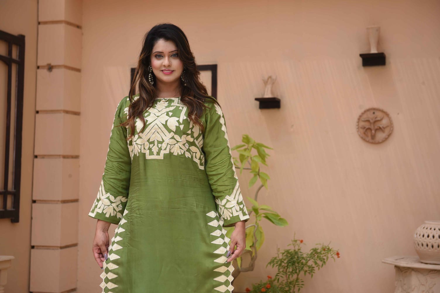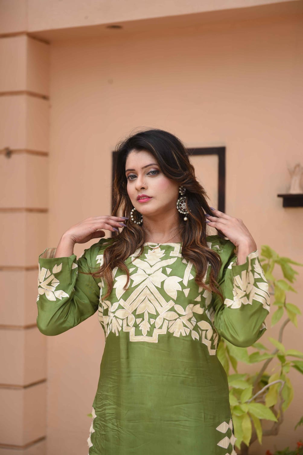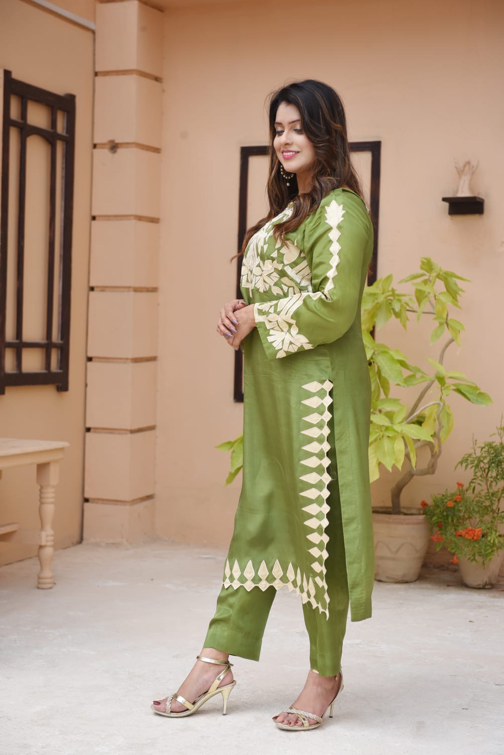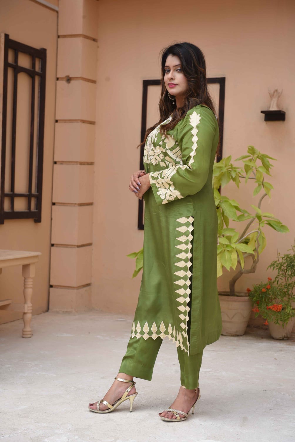 Exude effortless grace in this stunning two-piece ensemble. Crafted from premium Russian Silk, this outfit features a rich guacamole green hue that offers a sophisticated sheen. The tunic is adorned with intricate cream appliqué work across the neckline and sleeves, balanced by a unique geometric “sawtooth” border along the side slits and hem. Paired with matching straight-cut trousers, it’s the perfect choice for festive gatherings or elevated daytime events.Dm on WhatsApp to place your order