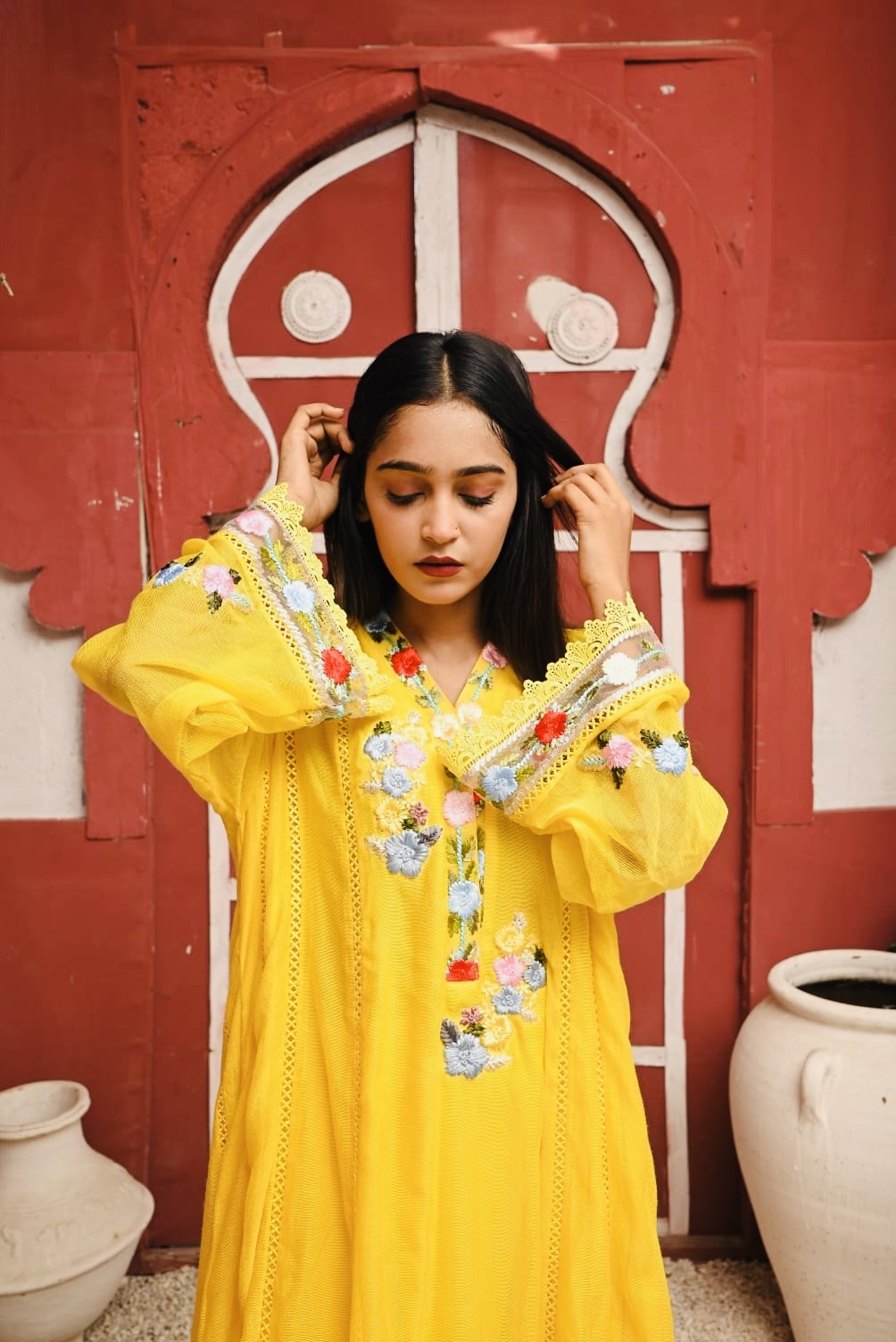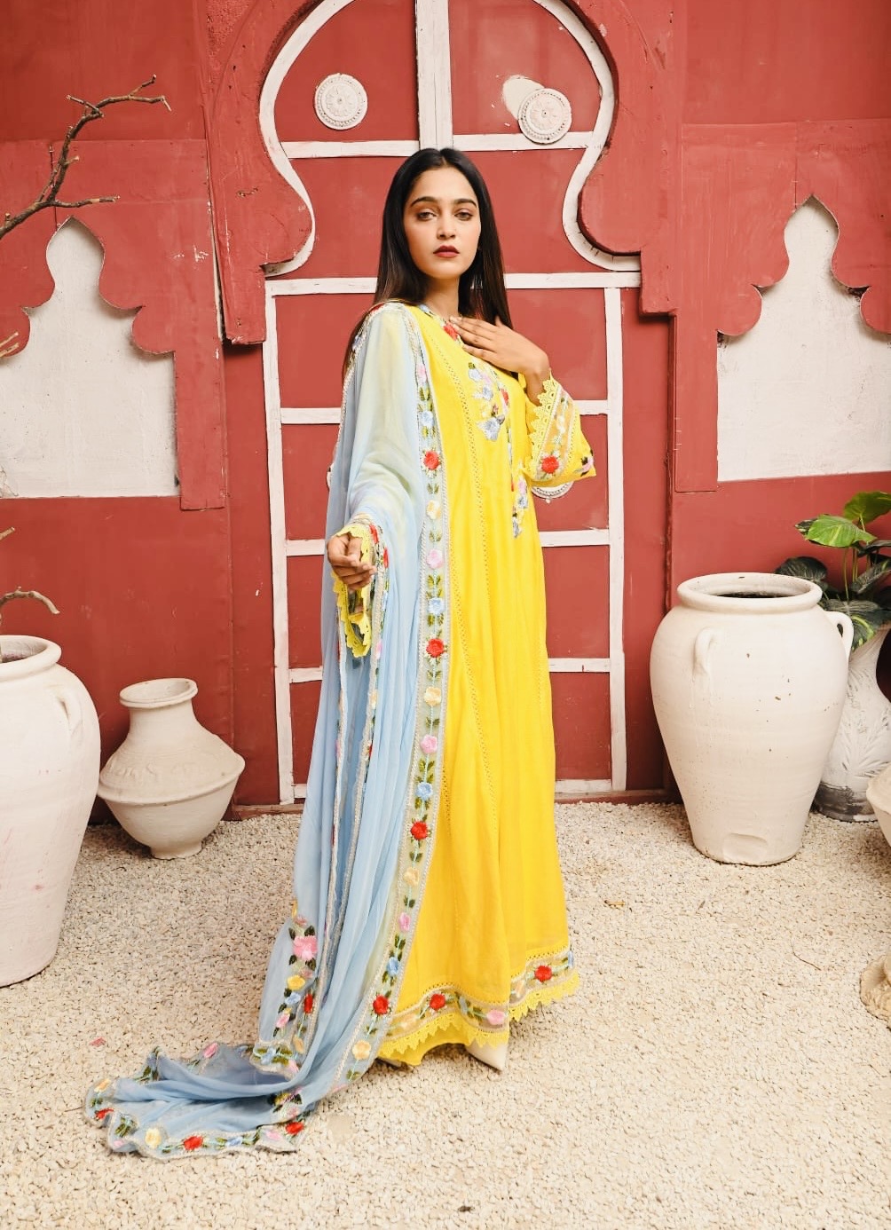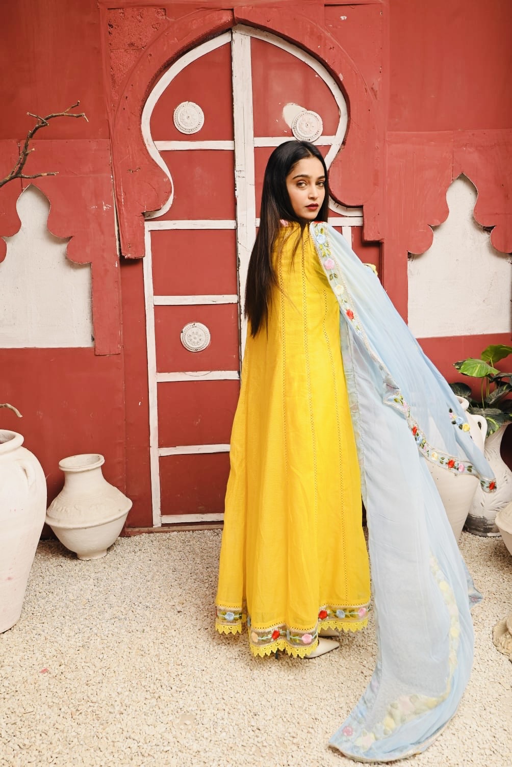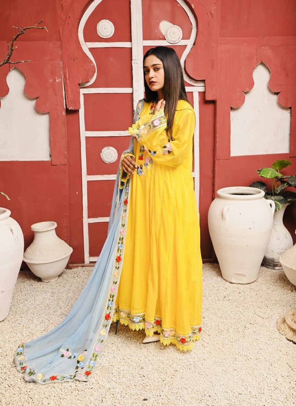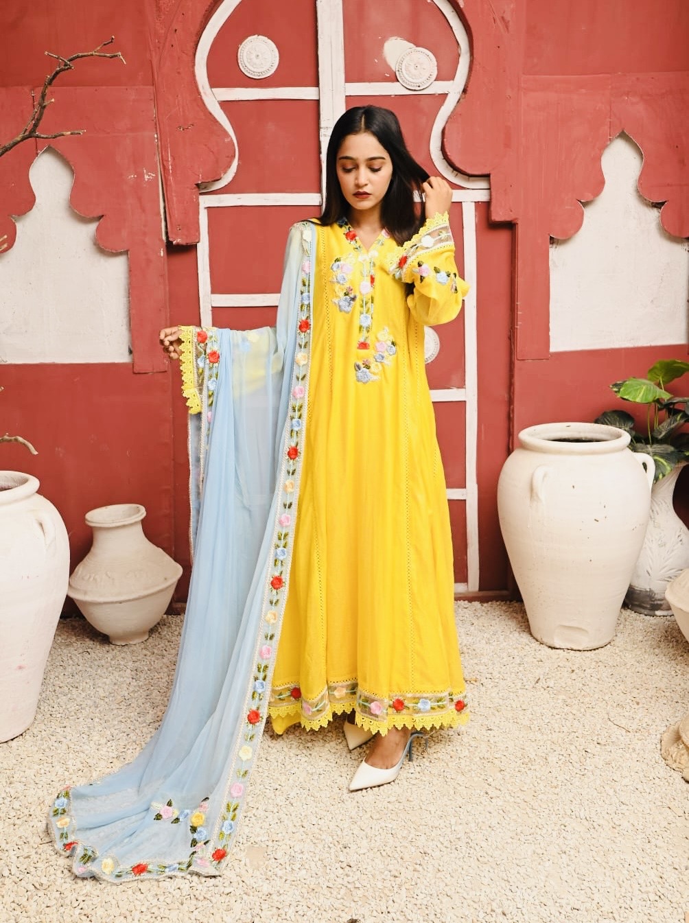 • Frock: Crafted from premium Khaadi Net in a radiant Eldorado yellow, featuring a sophisticated panelled silhouette that offers a graceful flare. The bodice and sleeves are adorned with delicate multi-color floral embroidery.