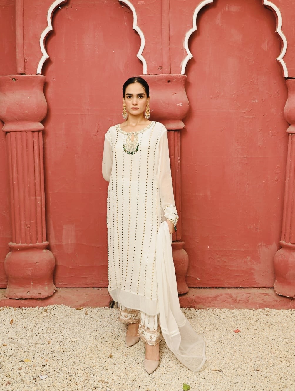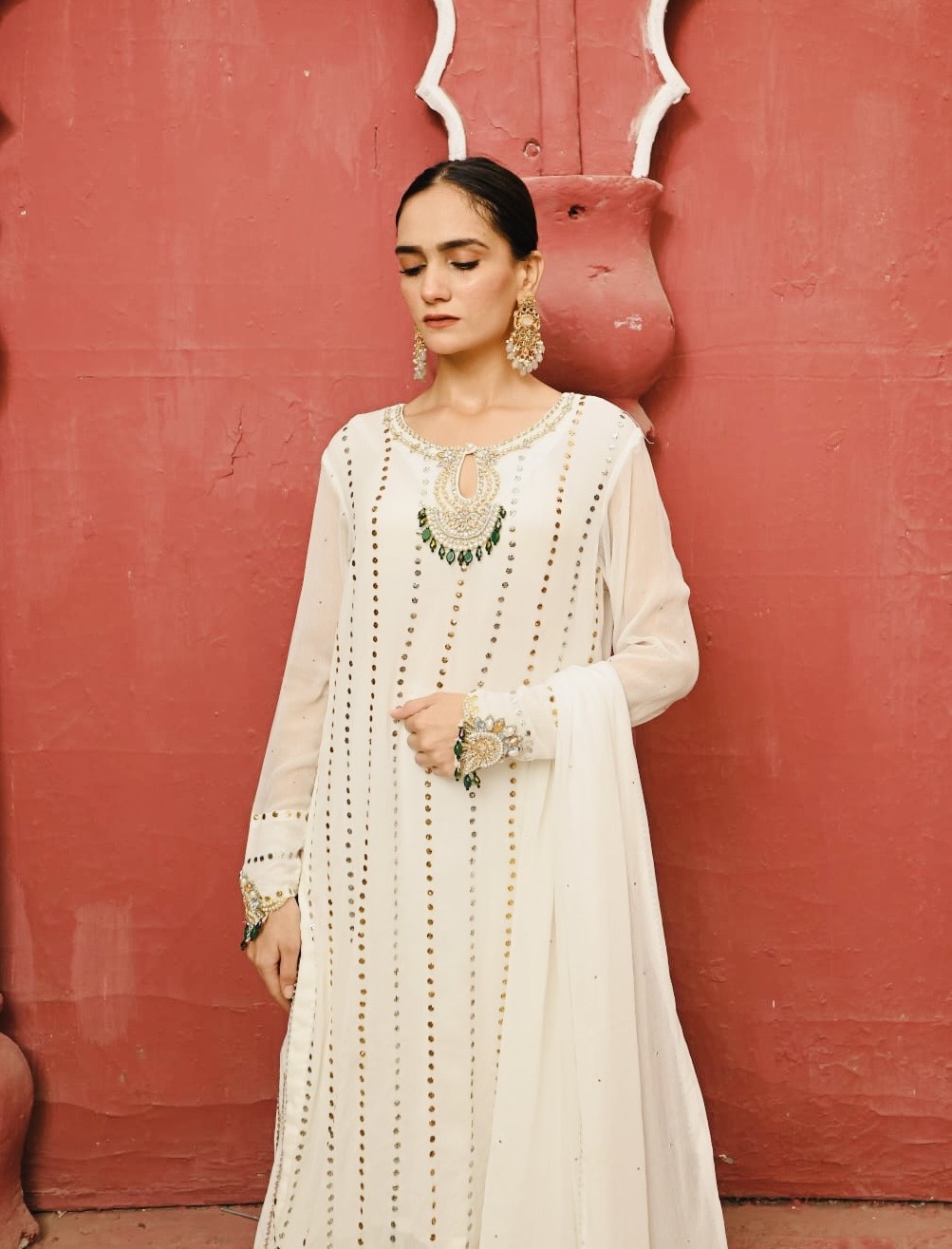 • Shirt: Features a fully worked Mukesh base on milky white chiffon. The neckline is the focal point, encrusted with hand-applied Dabka, stones, and sequins, highlighted by striking emerald green stones.