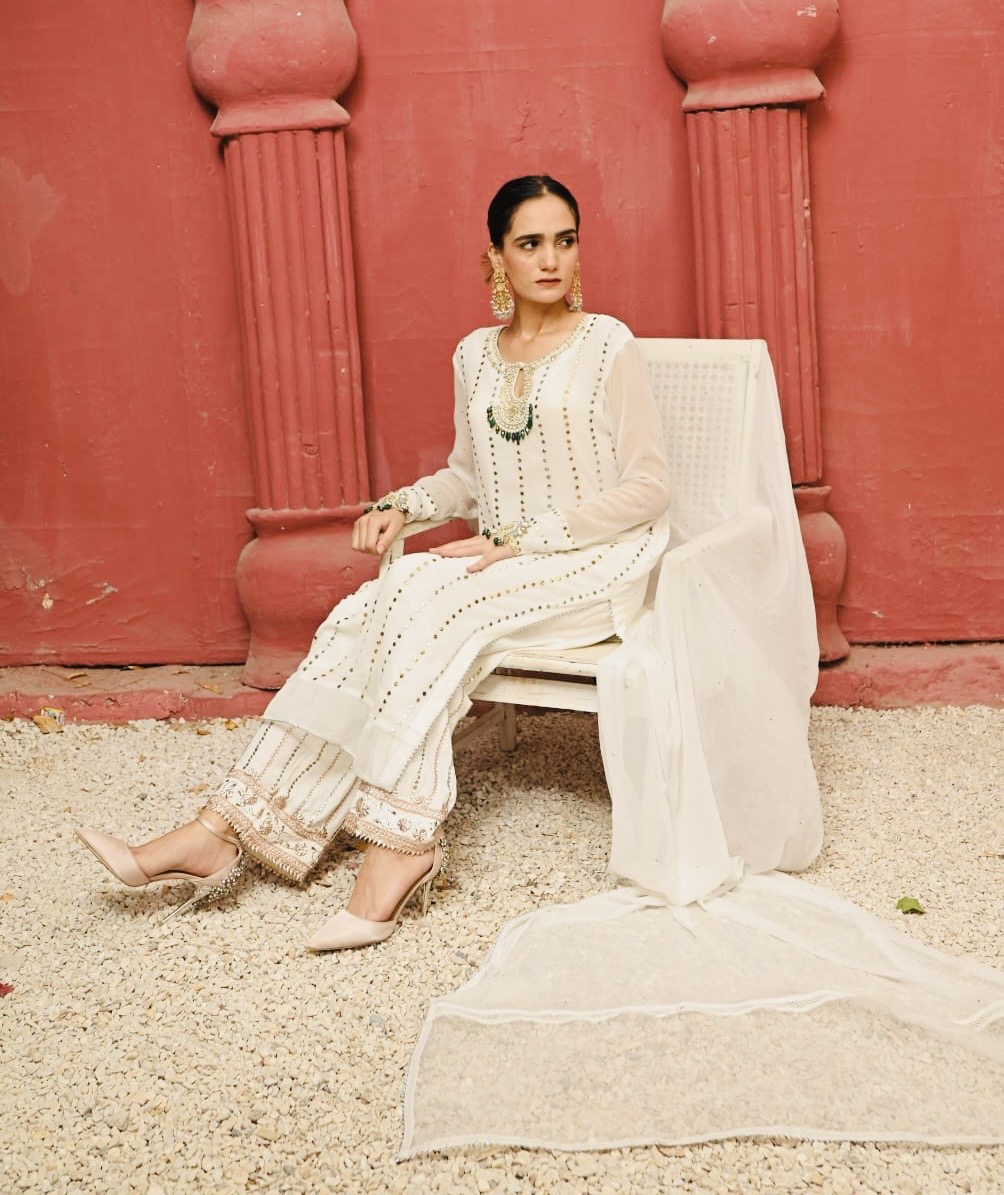 Experience the pinnacle of artisanal luxury with this Milky White Chiffon suit. Meticulously designed for formal occasions, this three-piece set combines the airy lightness of high-quality chiffon with the heavy, traditional shimmer of Mukesh and Dabka handwork.