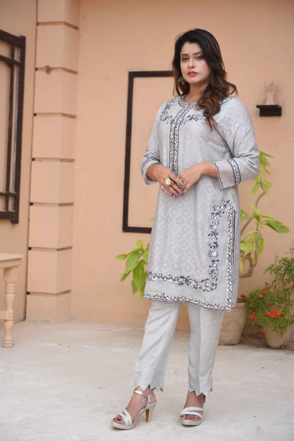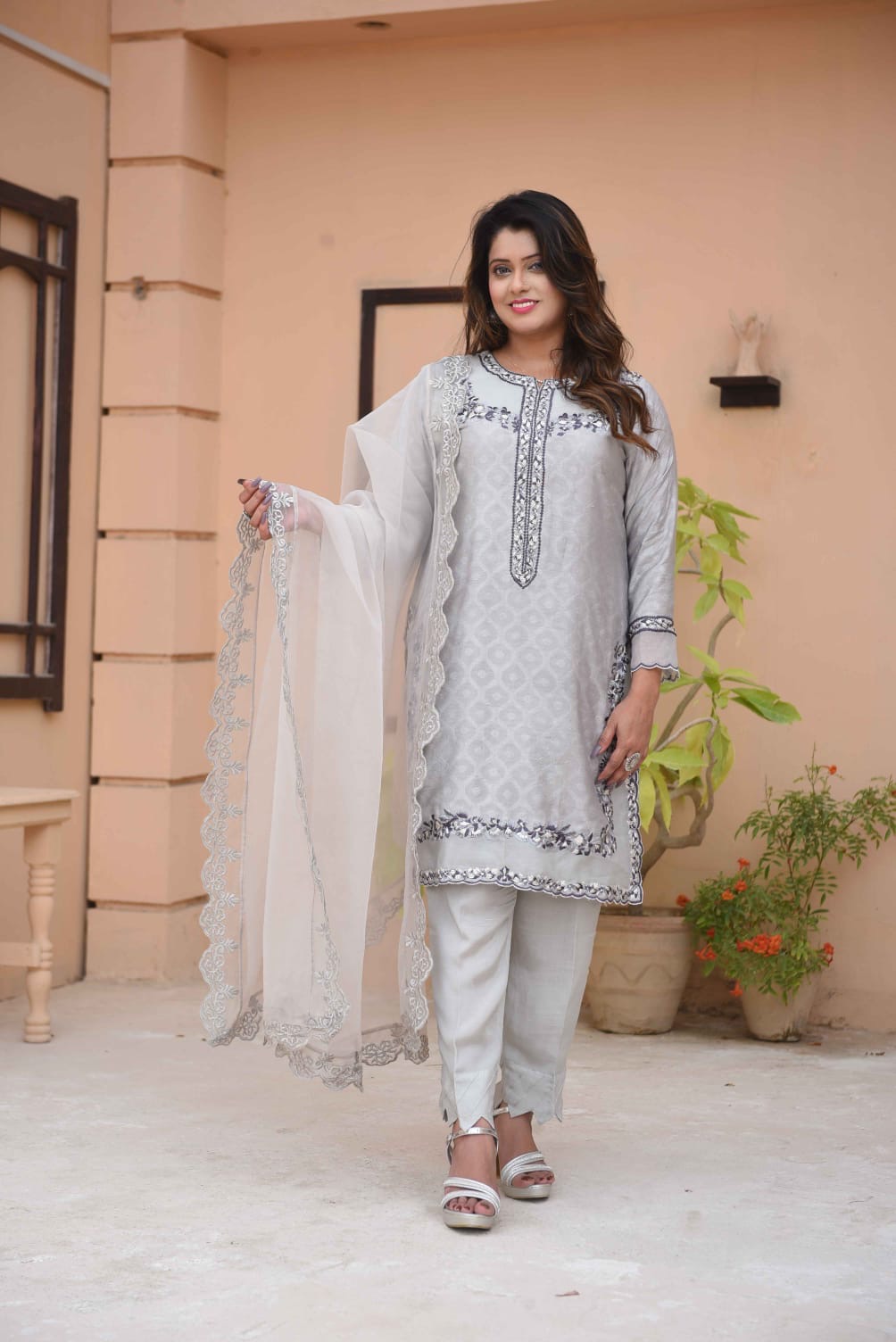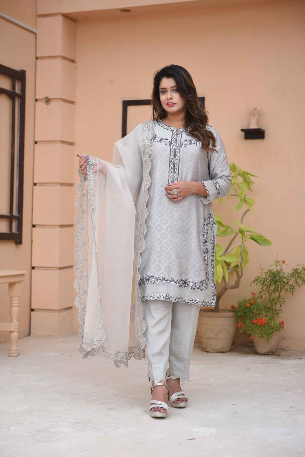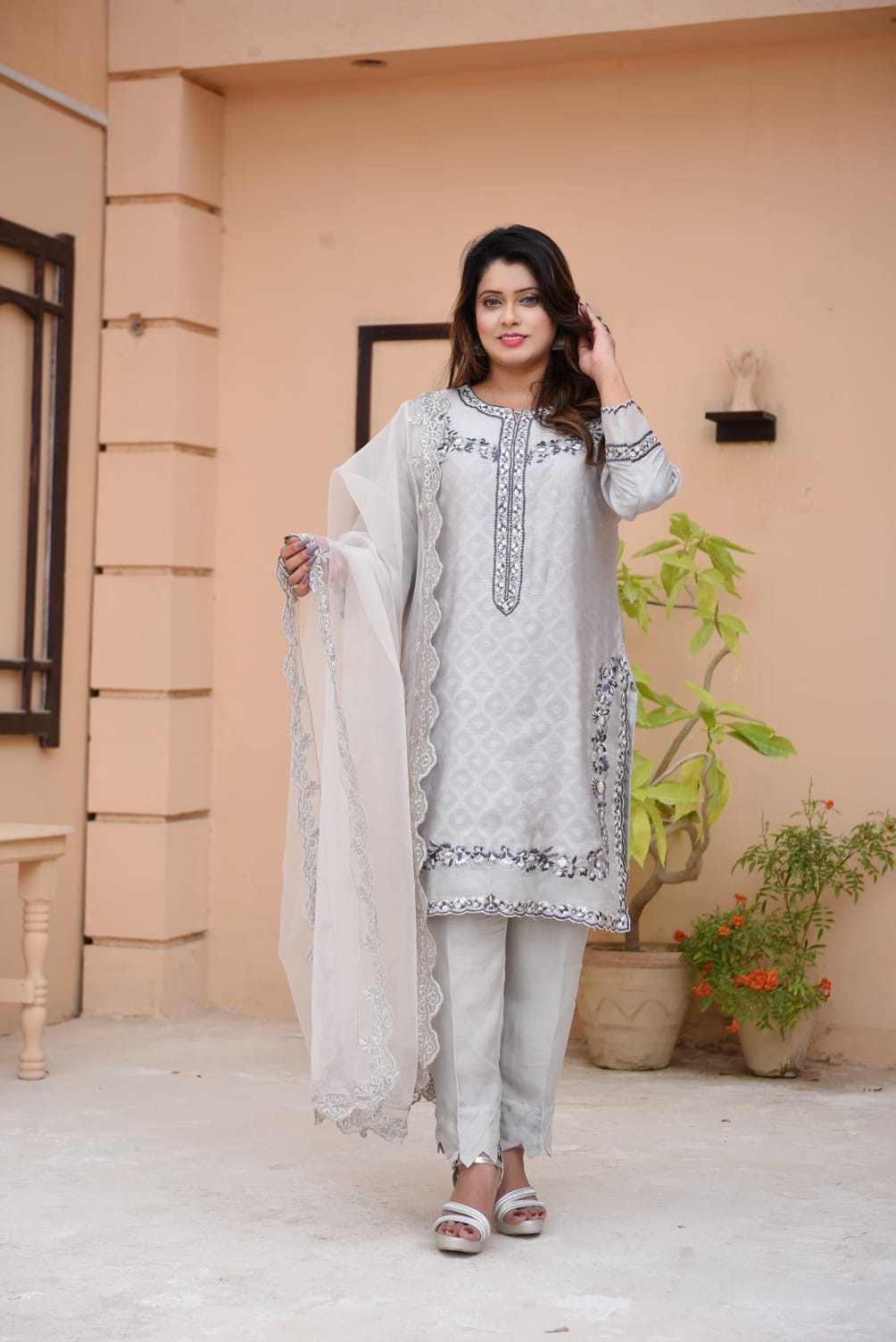 This elegant ensemble is the epitome of sophisticated charm, blending traditional craftsmanship with a modern, muted palette. Here is a detailed description of the outfit: