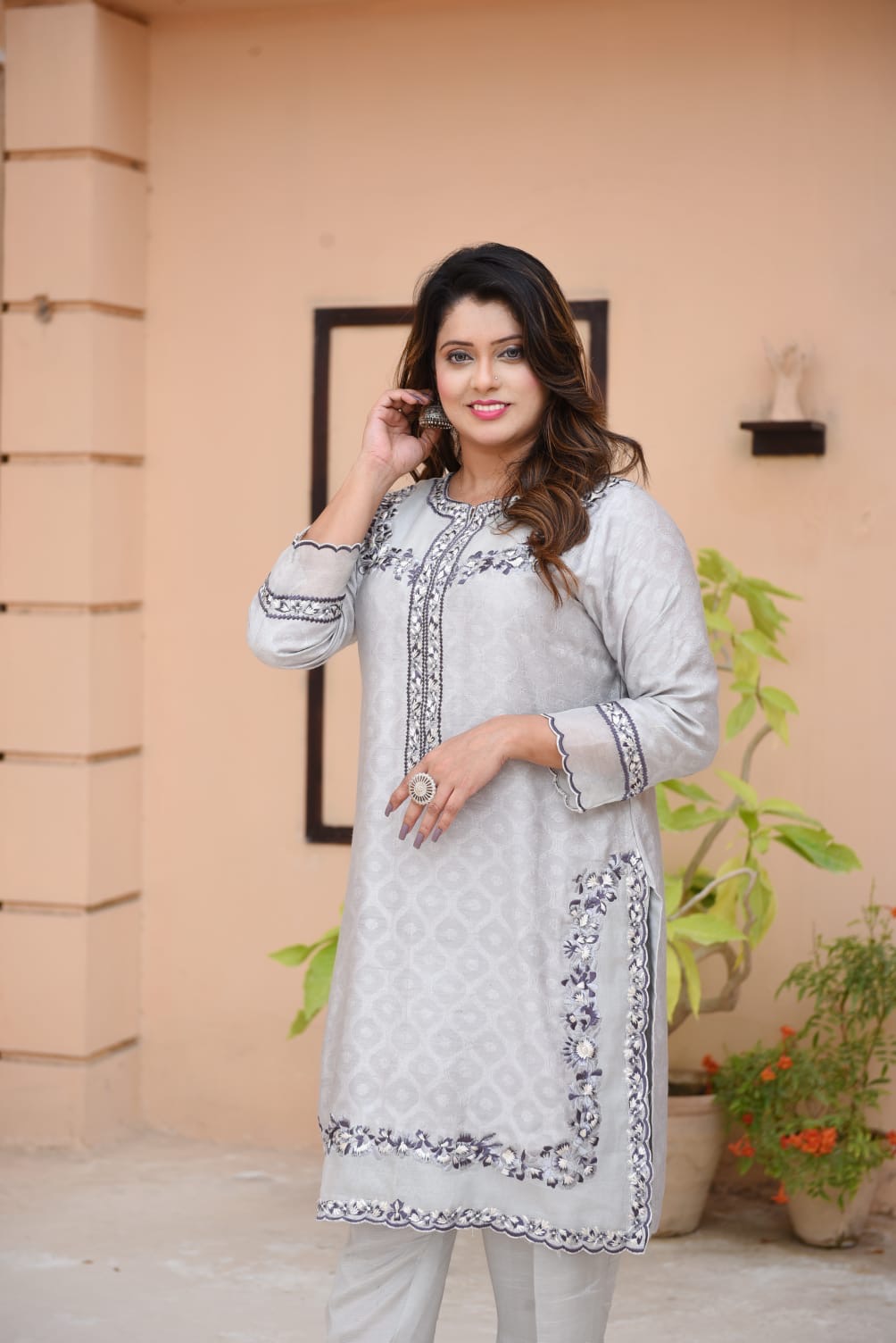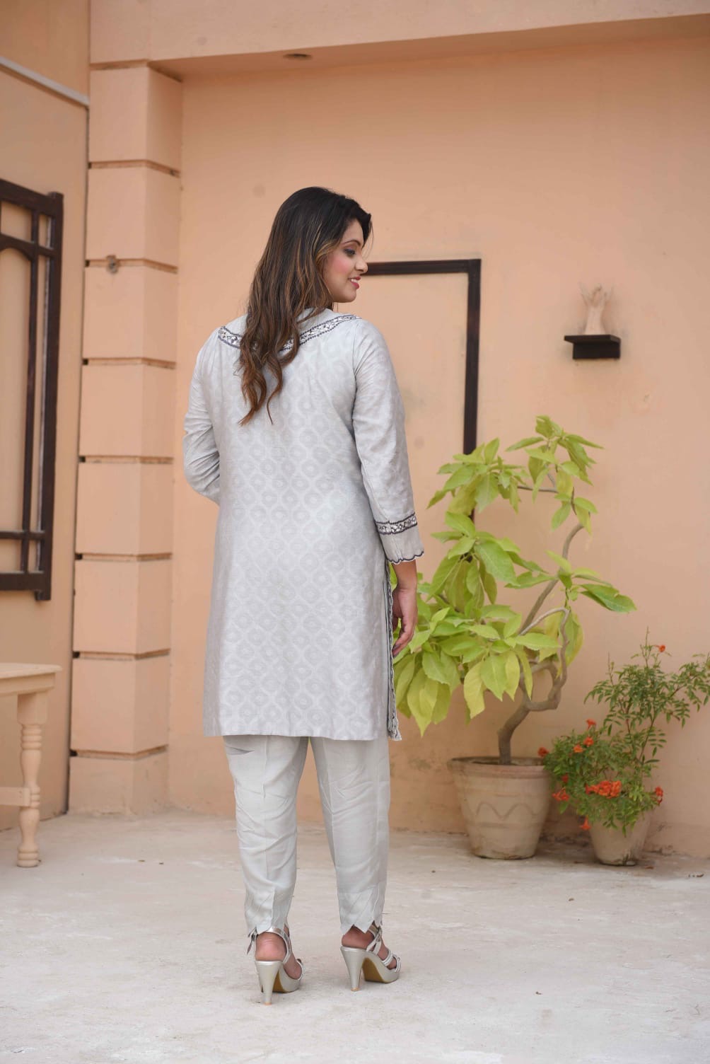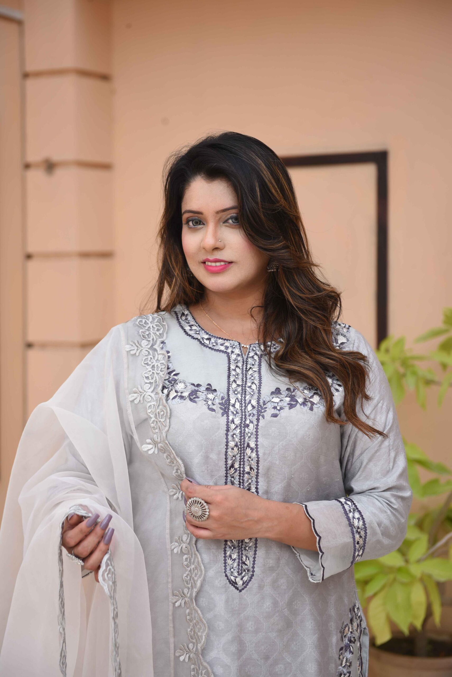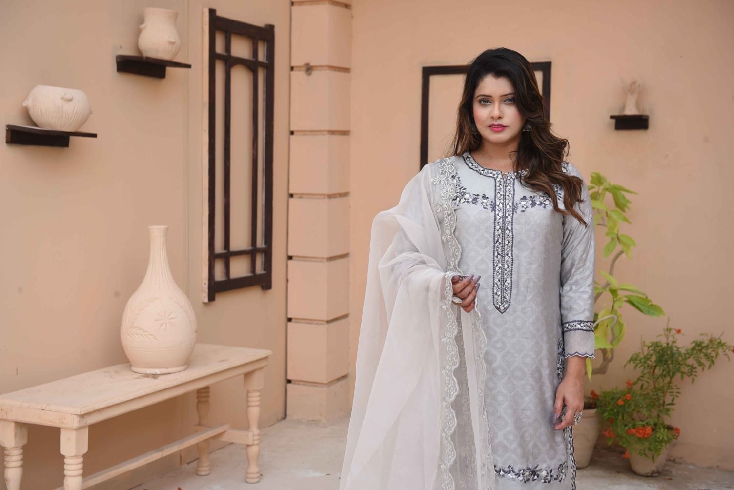 This elegant ensemble is the epitome of sophisticated charm, blending traditional craftsmanship with a modern, muted palette. Here is a detailed description of the outfit: